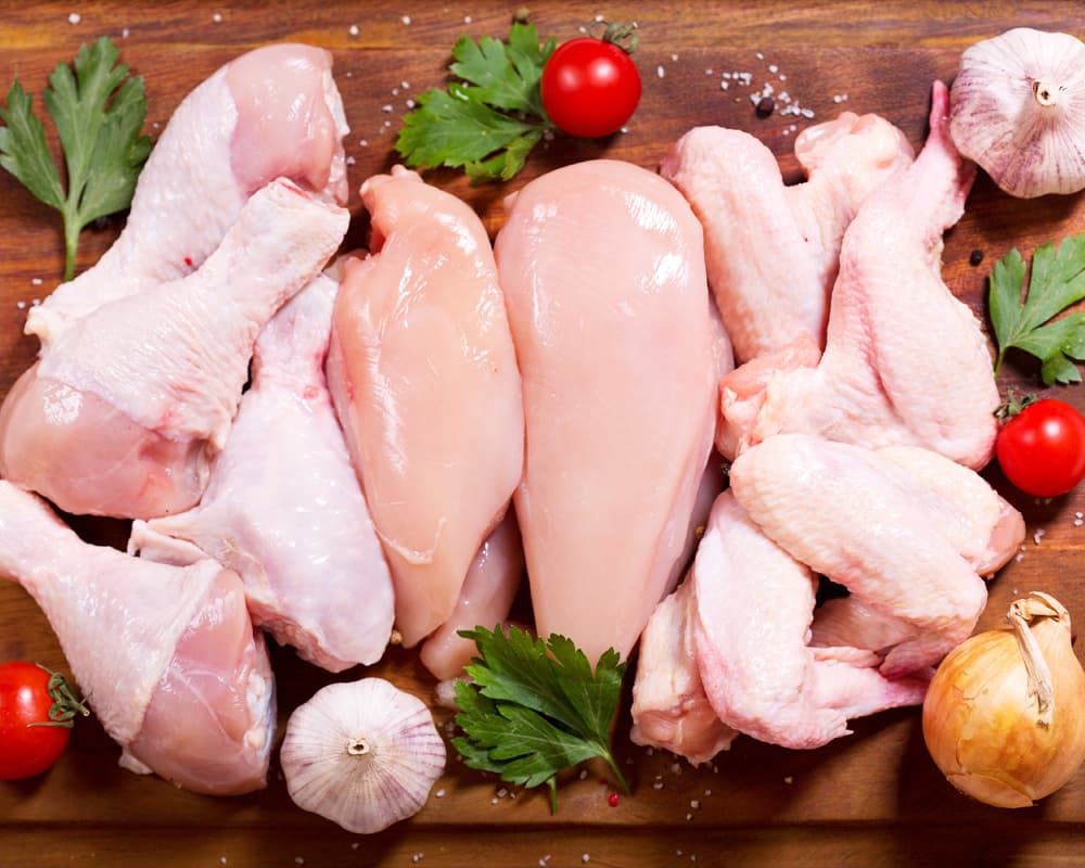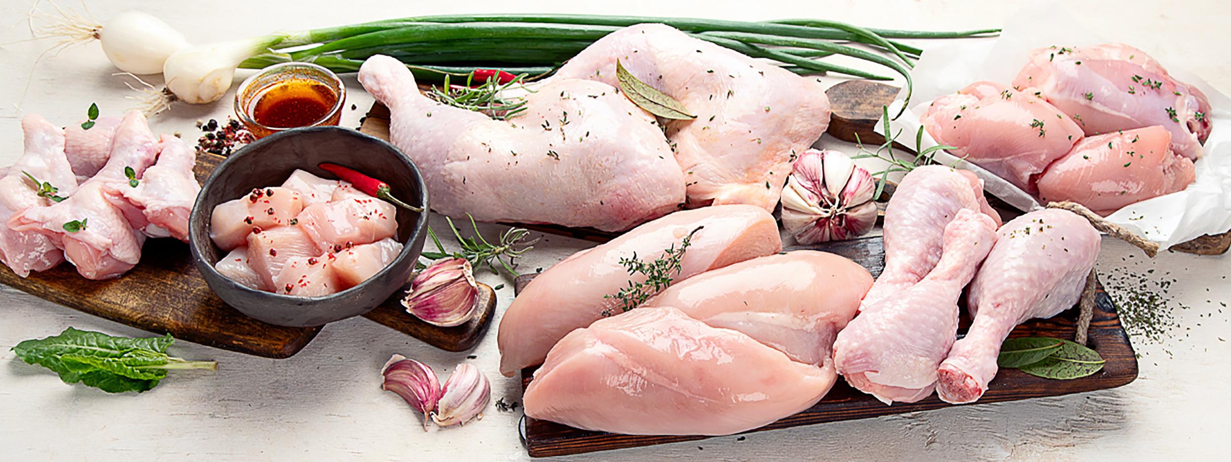 Chicken cuts include chicken breast, thighs, cutlets, drumsticks, nibbles and whole chickens